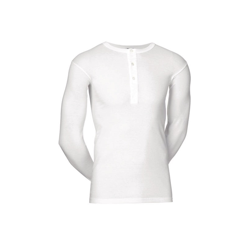 Langærmet t-shirt fra JBS i tidsløst hvidt grandad design med flot stolpe knaplukning foran på modellen samt en suveræn pasform.