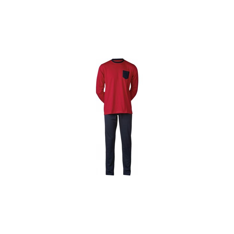 Dette lækre JBS Pyjamas-sæt med trøje og tilhørende buks er lavet af 100% Bomuld, der sikrer en behagelig oplevelse for brugeren. Bukserne indeholder elastik i både top og bund. Modellen er med mørk buks og blå skjorte med hvide detaljer ved den runde hals.