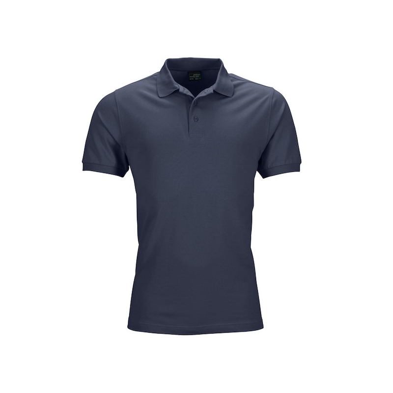 Navy blå, poloshirt fra James & Nicholson. Denne farver er blande de mest solgte. Kombination af bomuld, med 5% elastan giver en lækker poloshirt der holder formen.