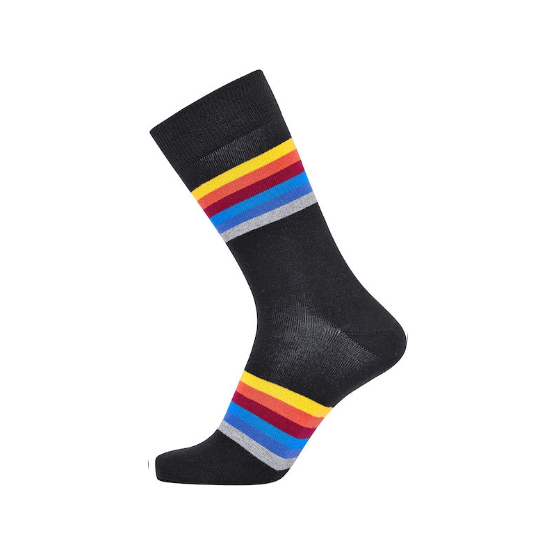 Flot sort strømpe med to sæt af farvestriber, der gør den ellers kedelige sorte strømpe til et mere livligt produkt. Skiller sig ud fra mængden. Lovende kvalitet fra JBS.