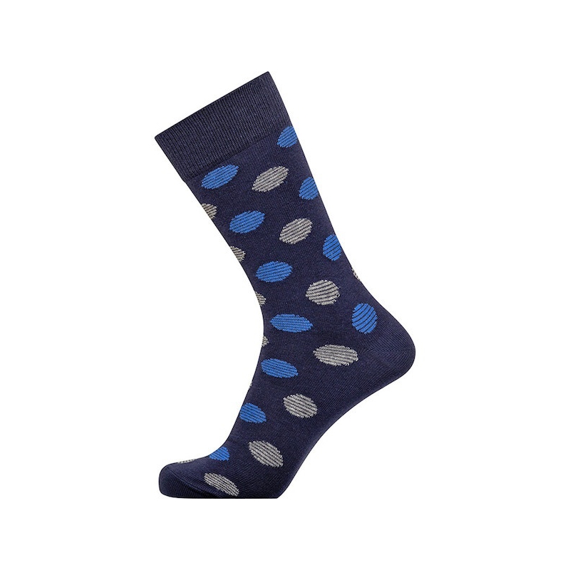 God bomuldsstrømpe fra Claudio. Strømpen er i farven navy med blå og grå prikker – Det flotte design er på en gang tilbagelænet, og udfordrende. Et godt på en afløser til de sorte strømper.